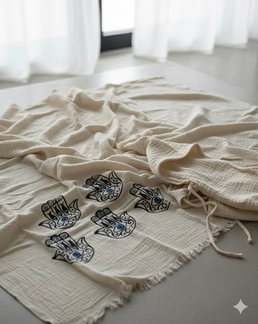 Musselin Sauna- & Strandtuch | 100% Bio-Baumwolle | Hamsa-Motiv
